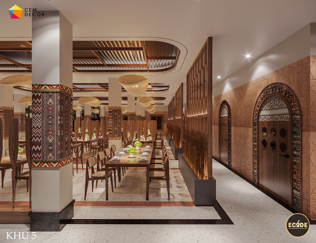 Tại dự án này, gạch 3D bê tông trang trí của CEMDECOR đã được lựa chọn như một giải pháp vật liệu chủ đạo cho các mảng tường, góp phần định hình phong cách không gian – mộc mạc, bản địa nhưng vẫn hiện đại và có chiều sâu.