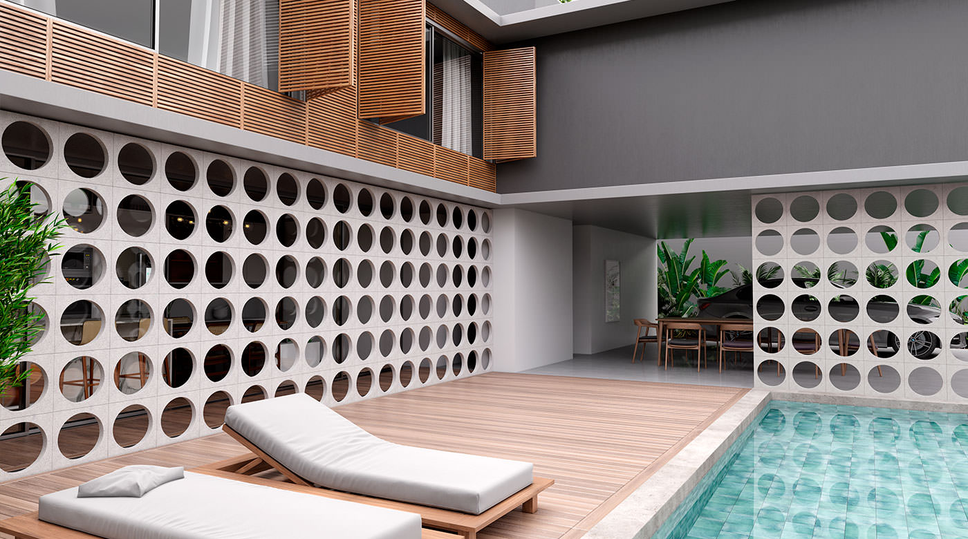 - Khu vực sân vườn – hồ bơi: Gạch thông gió giúp kết nối thiên nhiên, giữ được sự riêng tư mà vẫn thoáng đãng, nhẹ nhàng.